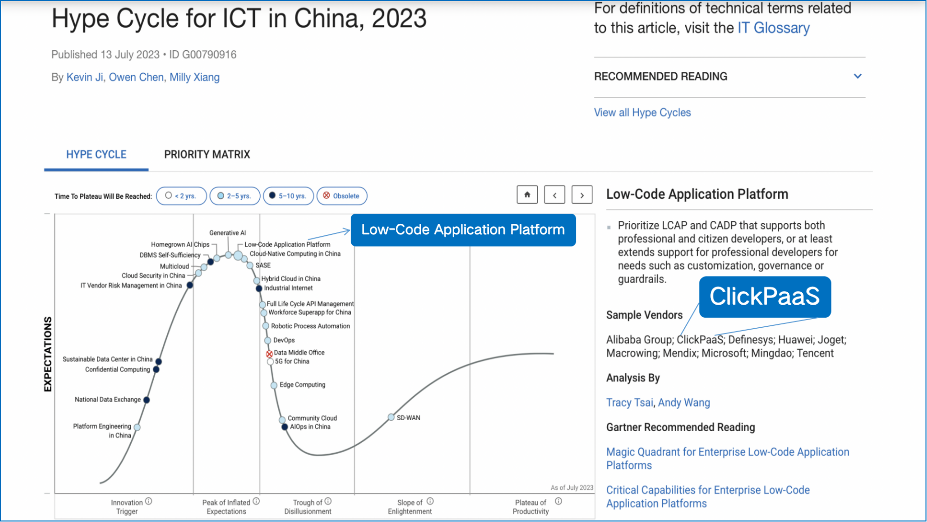 近日,国际权威研究机构Gartner发布了《Hype Cyple for ICT in China,2023(2023年中国ICT技术成熟度曲线)》报告,ng28娱乐注册入口凭借平台的aPaaS+iPaaS+DaaS保障业务系统的一站式设计,多租户、热发布、国际化、信创安全等特性实力登榜,并作为低代码PaaS平台代表厂商TOP2入选本次报告。